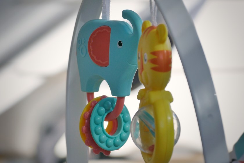 The fabric Bright Starts toy bar is extremely easy to remove and replace when strapping Baby into the seat. We found that the plastic Fisher-Price toy bar—although equally cute and entertaining—is not.