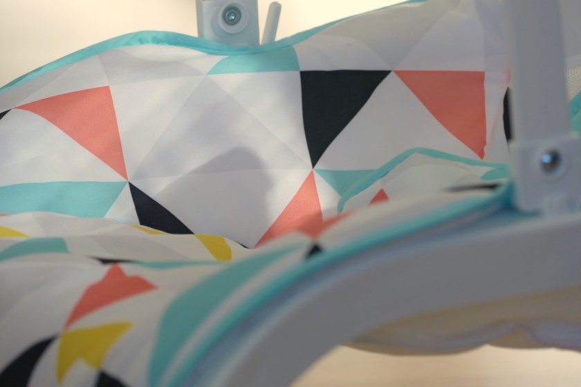 Winner: Fisher-Price. We prefer the modern geometric pattern and gender-neutral color of the Windmill rocker. The Bright Starts Toucan Tango has a microfiber-style fabric which we don’t like as much as the Windmill’s smooth polyester seat. Both are machine washable.
